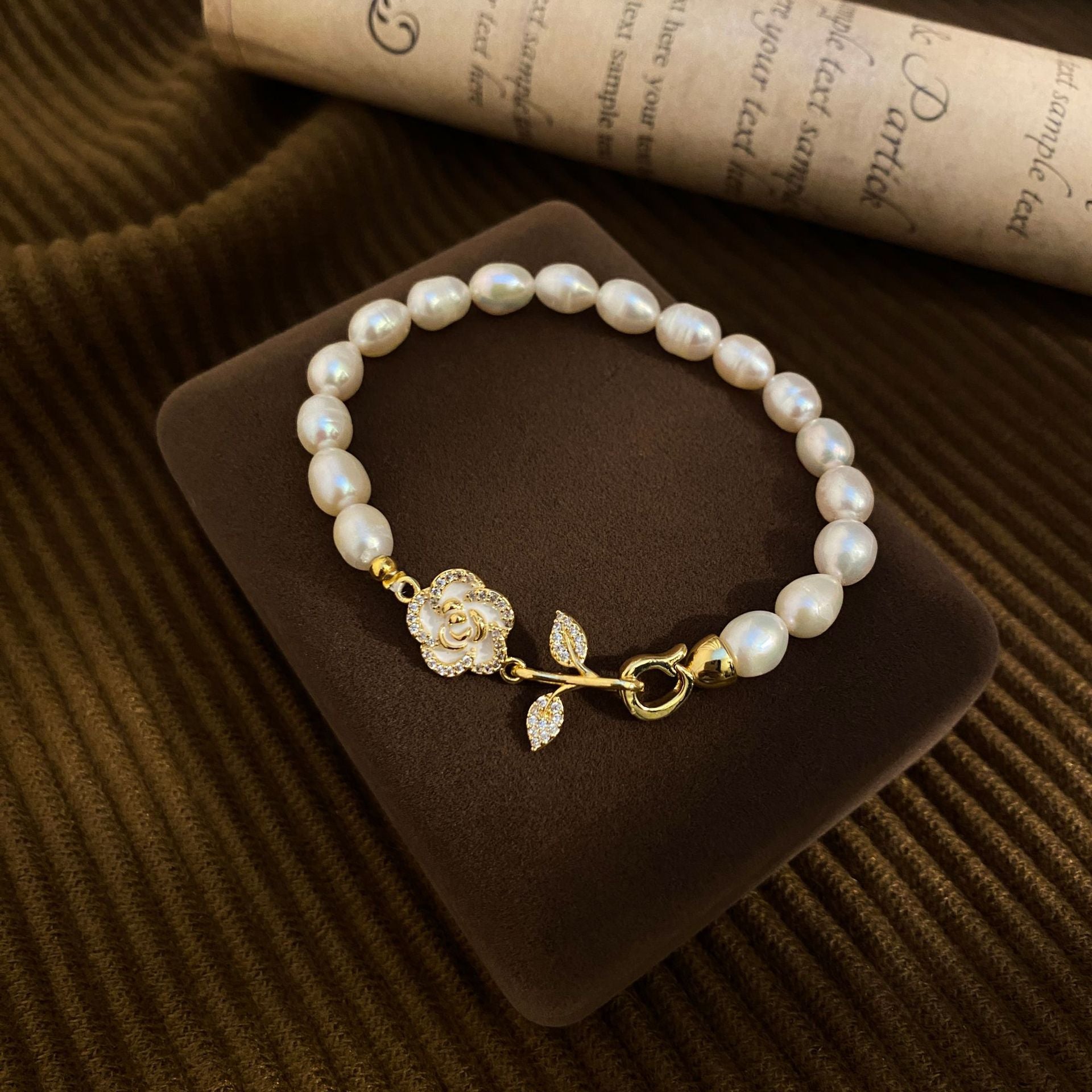 - Elements: Freshwater oval pearls; gold-tone camellia charm with crystal micro-setting