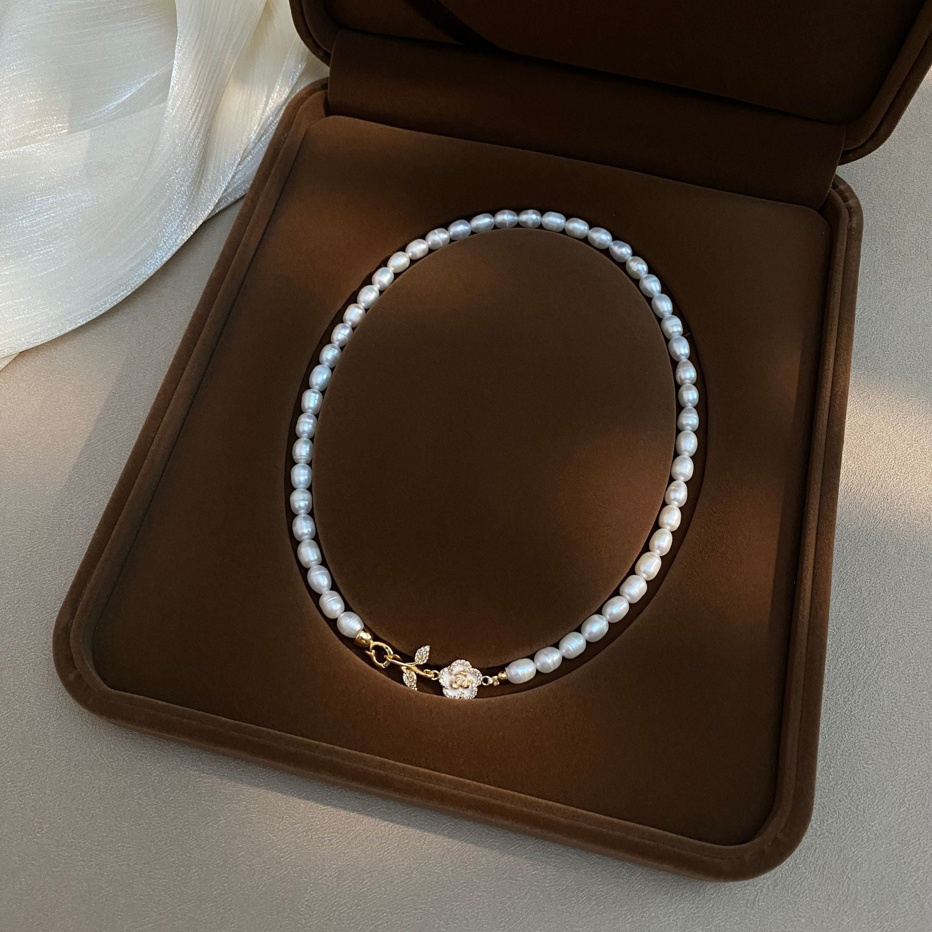 Embrace refined beauty with this harmonious duo—perfect for layering, gifting, or everyday grace. Each piece features softly oval freshwater pearls (5–6 mm), hand-strung for fluid elegance. At the heart of each piece rests a captivating camellia pendant, delicately detailed with subtle crystal accents and finished in a warm gold-tone.